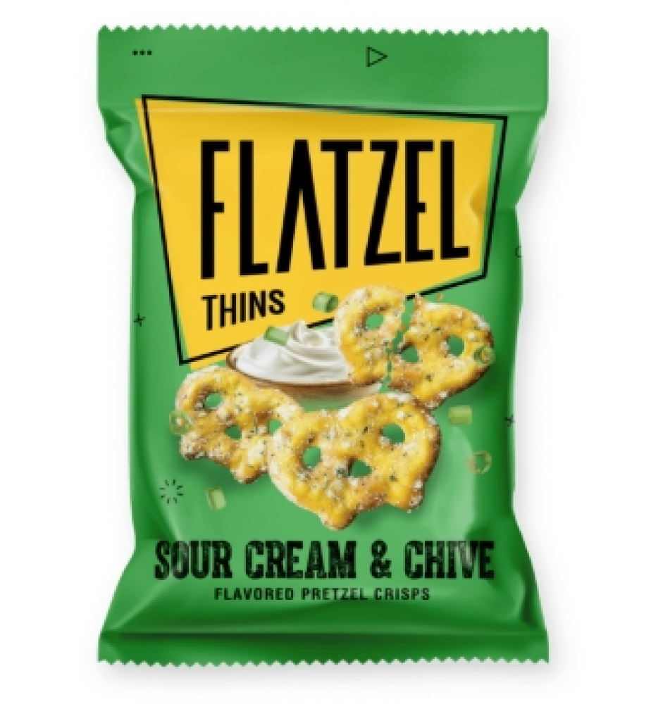 Flatzel Thins Zure Room & Bieslook 85 g is een hartige snack die de rijke, romige smaak van zure room combineert met de frisse, aromatische smaak van bieslook.