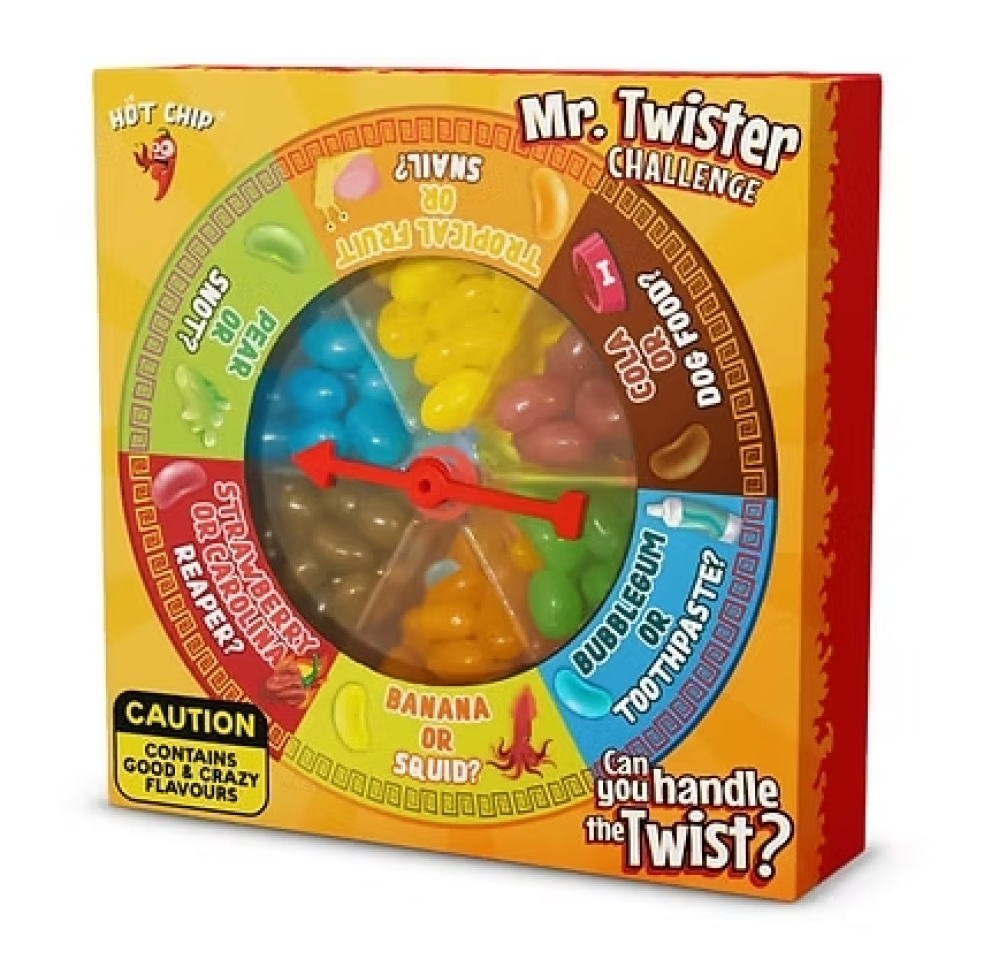 Durf jij deze uitdaging met aan? Elke draai kan je brengen op een zoete verukking of een wilde verrasing! Heb je een jelly bean in de smaak van cola of bereid je je voor op een onverwachte smaak, zoals hondenvoer. Misschien proef je een zoete aardbei of word je geconfronteerd met een Carolina Reaper-chilipeper? Deze twister game bevat een mix van deze jelly beans waardoor het elke keer een verrassing blijft.