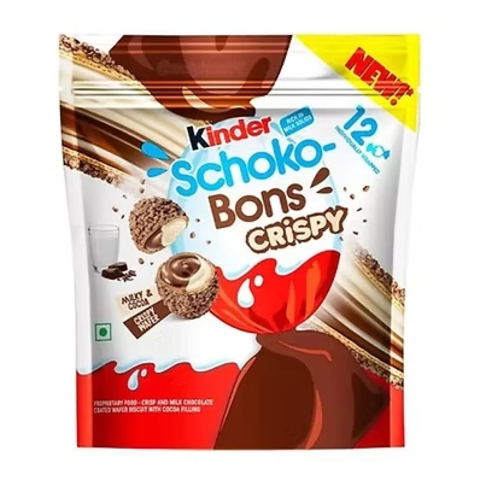 De favoriet van iedereen: Kinder Schoko Bons Crispy! Individueel verpakte, crispy schoko bons met romige melk- en cacaovulling omhuld met wafelbiscuit en bedekt met verukkelijke cacaohagelslag. Dit product is sinds kort beschikbaar bij American Candyworld., maar nu al een best-seller! Geïmporteerd uit India en overheerlijk van smaak!